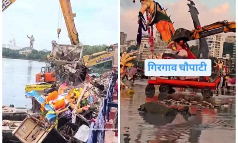मुंबईतील गिरगाव चौपाटीवर गणेश विसर्जनाच्या वेळी हृदय पिळवटून टाकणारे दृश्य पाहायला मिळाले. भक्तिभावाने आणलेल्या मोठ्या मूर्ती जेसीबी व इतर यंत्रांच्या सहाय्याने समुद्रात उतरवताना आडव्यात टाकल्या जात असल्याचे अनेकांनी पाहिले. काही ठिकाणी तर मूर्तीला चक्क ढकलून दिल्याचेही दृश्य उघड झाले.