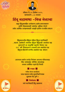 हिंदू महासभेच्या वतीने “हिंदू महासभा – मित्र मेळावा” या विशेष कार्यक्रमाचे आयोजन रविवार, दि. २१ डिसेंबर २०२५ रोजी सायंकाळी ५.३० वाजता करण्यात आले आहे. हा कार्यक्रम गणेश मंगल कार्यालय भाऊ महाराज बोळ, तुळशीबागेजवळ, शुक्रवार पेठ, पुणे २ ,येथे होणार आहे.
