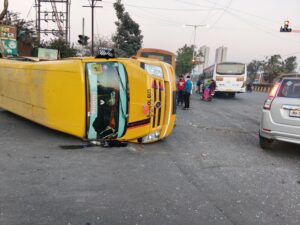 स्पाईन रोड मोशी येथील सरदार वल्लभाई पटेल चौकात आज एक स्कूल बसचा भीषण अपघात झाला. बस वाहनचालकाचा अचानक ताबा सुटल्याने बस रस्त्यावर पलटी झाली. या घटनेमुळे परिसरात एकच खळबळ उडाली.